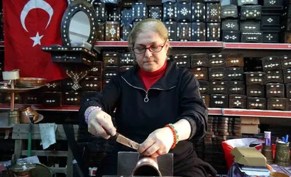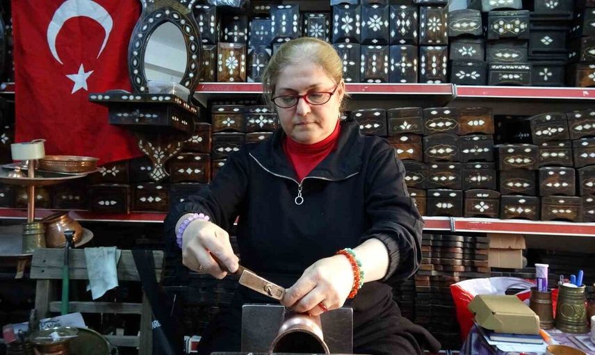 Katıldığı kursla başlayan yolculuğunda kendini mesleğinde bularak hem üretmenin hem de maddi katkı sağlamanın tatminini yaşayan Emine Sibel Bakırcı, Gaziantep’te bakır işlemeciliğinin yaşatılmasına katkı veriyor.
