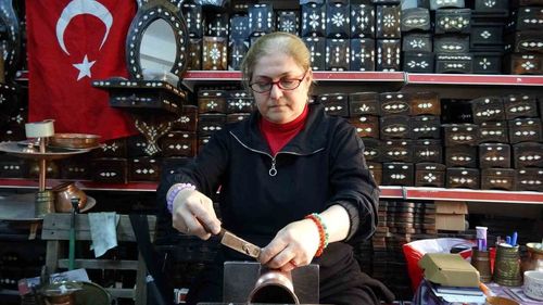 54 yaşındaki Emine Sibel Bakırcı, Gaziantep’te katıldığı kursla bakır işlemeciliğini öğrenip 10 yıldır eser üretiyor; kalfalık, ustalık ve usta öğreticilik belgelerine sahip.