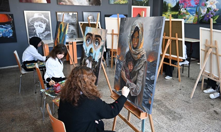 Öğrencilerden İrem Hezer, savaşın ortasında kalan anne ile çocuğunu tuvaline yansıttığını anlattı. Diğer bir öğrenci Emine Ezel Şahin ise yaptığı resimde Gazze'deki acıyı hissettiğini belirterek, "Aynı şey bizim başımıza gelseydi neler yaşayacağımızı düşünmek çok üzdü. Hiçbir şey yapamamak daha da üzdü. Yaptığım resimle en azından ufak da olsa bilinç oluşturmak istiyorum. Hem geleceğimiz için hem de Gazze’deki kardeşlerimiz için,” ifadelerini kullandı.