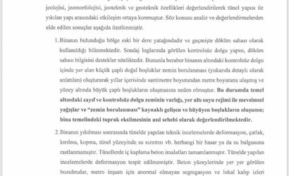 Bilim kurulu raporu, metro tünellerinin etkileşimine ilişkin teknik incelemeler sonucunda tünellerde çatlak, deformasyon, kayma veya su sızıntısı bulgusuna rastlanmadığını not ediyor. Raporda, metro tünellerinin sağlam kaya birimi içinde inşa edildiği, ölçümlerde eksenel sapma veya yapısal bozulma tespit edilmediği ve tünel kazılarının yüzeydeki yapılarla etkileşiminin kabul edilebilir sınırlar içinde kaldığı bildiriliyor.