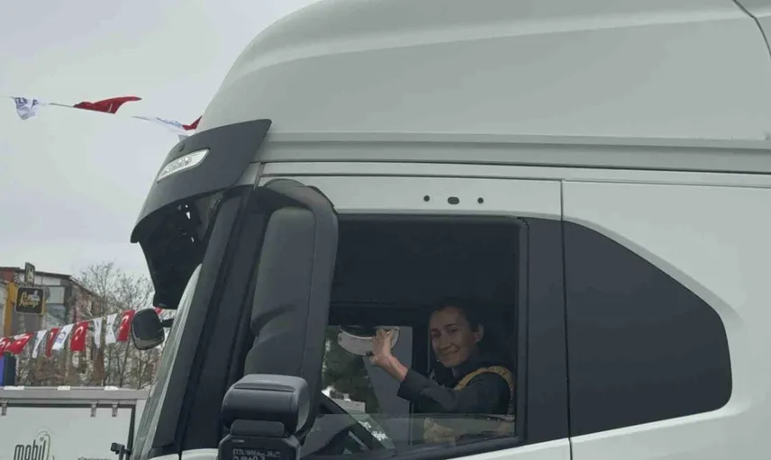 KONVOYDAKİ TIRLARDAN BİRİNİN DİREKSİYONUNDAKİ KADIN SÜRÜCÜ, VATANDAŞLARDAN ALKIŞ ALDI.