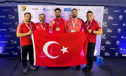 Polonya'da devam eden Gençler ve 23 Yaş Altı Avrupa Halter Şampiyonası'nda genç erkekler 96 kiloda milli sporcu Enes Çelik (arka ortada) 2 altın, 1 gümüş madalya kazandı.