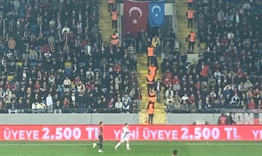 Trendyol Süper Lig’in 12. haftasında oynanan maçta Gençlerbirliği taraftarları, ev sahibi ekibin maraton tribününe Doğu Türkistan bayrağı astı.
