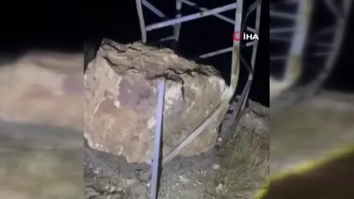 Aydınlı Mağaralı'da yamaçtan kopan dev kaya elektrik direğine çarparak durdu. Kopan teller yenilenip 4 saatte onarım tamamlanınca köye elektrik verildi.