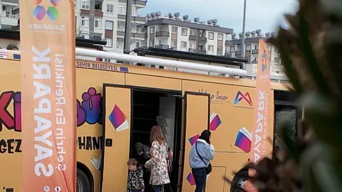 Mersin Büyükşehir Belediyesi'nin Gezici Kütüphane Otobüsü, Sayapark AVM'de çocuklarla buluştu; ücretsiz kitap okuma ve kütüphane deneyimi sağlandı.