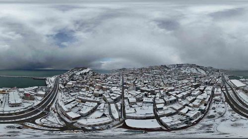 Giresun’da karla kaplanan kent, Gedikkaya, Giresun Kalesi ve Giresun Adası’nın drone görüntüleriyle maviyle beyazın buluşmasını sergiledi.