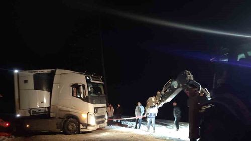 Giresun'da yoğun kar nedeniyle Yavuzkemal Belde Belediyesi ekipleri, dün gece mahsur kalan bir tırı kurtardı; il genelinde 76 köy yolu ulaşıma kapalı.