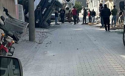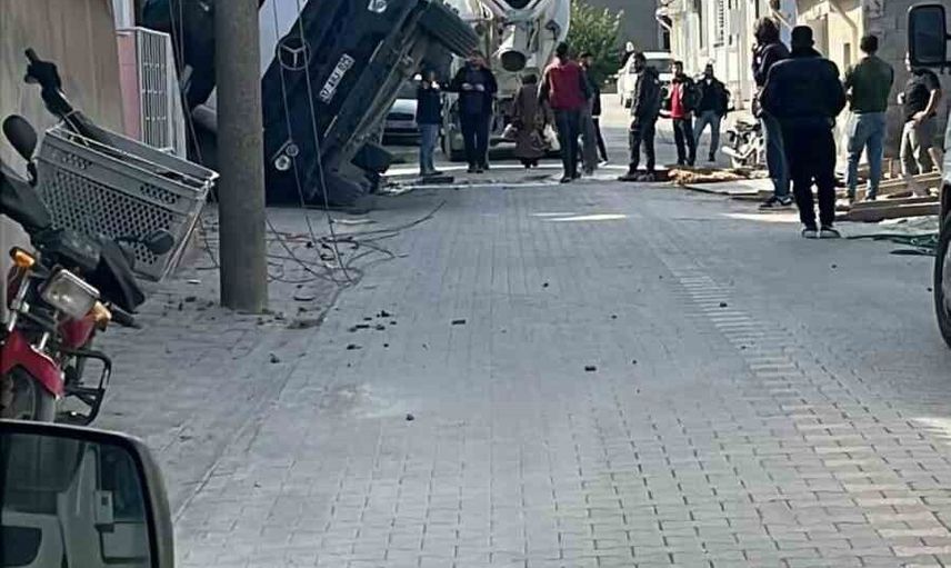 Balıkesir'in Gönen ilçesi Reşadiye Mahallesi'nde çalışma esnasında bir beton mikseri, henüz belirlenemeyen bir nedenle yan yattı.