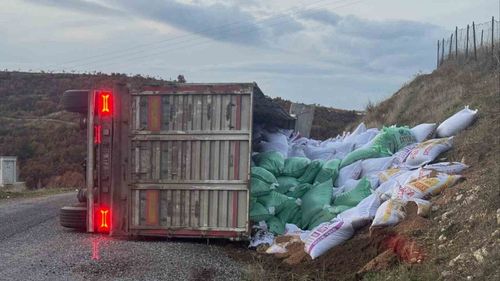 Manisa'nın Gördes ilçesinde sabah 08.35'te yem yüklü tırın virajı alamayıp devrilmesi sonucu sürücü Ümit Balta yaralandı; jandarma ve sağlık ekipleri müdahale etti.