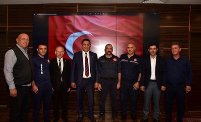 Gümüşhane'de Harşit Çayı'na düşen Türk bayrağını çıkaran itfaiye eri Engin Özyurt, plaket ve altınla ödüllendirildi. Belediye Başkanı Vedat Soner Başer (solda), itfaiye eri Özyurt'u (sağda) makamında ağırladı.