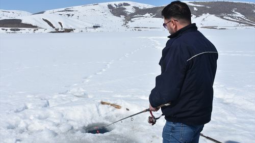 Gümüşhane'nin Kelkit ilçesindeki Sadak Baraj Gölü, balık tutkunlarını buz üzerinde bir araya getiriyor.