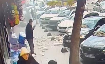 Çökme sırasında ortaya çıkan parçalar cadde üzerindeki bir park halindeki otomobile zarar verdi. Olay anları güvenlik kamerası kayıtlarına yansıdı.