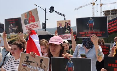 Tiflis'teki Yeni Spor Sarayı'nın önünde öğle saatlerinde toplanan bir grup gösterici, burada devam eden Dünya Eskrim Şampiyonası'na katılan 25 Rus sporcudan 17'sinin Rusya ordusunda görevli veya onunla ilişkili olduğunu öne sürdü.