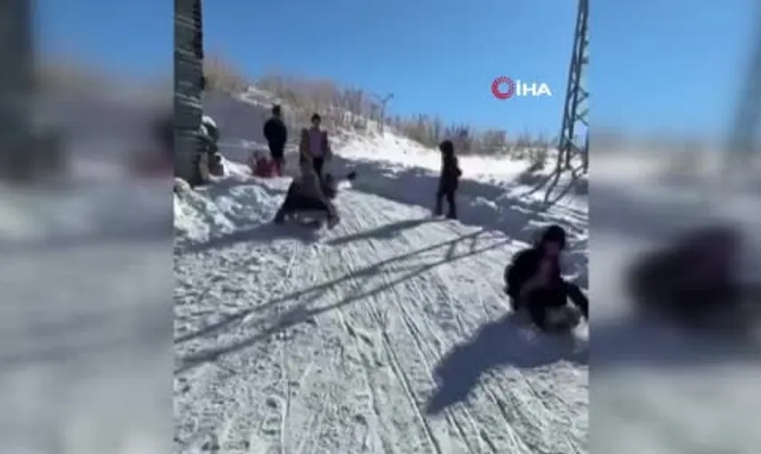 Erzurum'un Narman ilçesine bağlı Güvenlik köyünde, karne dağıtımı öncesinde iki kadın öğretmen öğrencileri için özel bir etkinlik düzenledi. Öğrenciler, kızaklar ve poşetlerle kayarak hem eğlendi hem de karın tadını çıkardı.