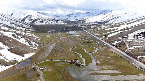 Bitlis'in Tatvan ile Hizan ilçeleri arasındaki Güzeldere Vadisi'ndeki menderesler, baharın gelişiyle drone ile havadan görüntülendi; kıvrımlı akışlar kartpostallık manzara sundu.