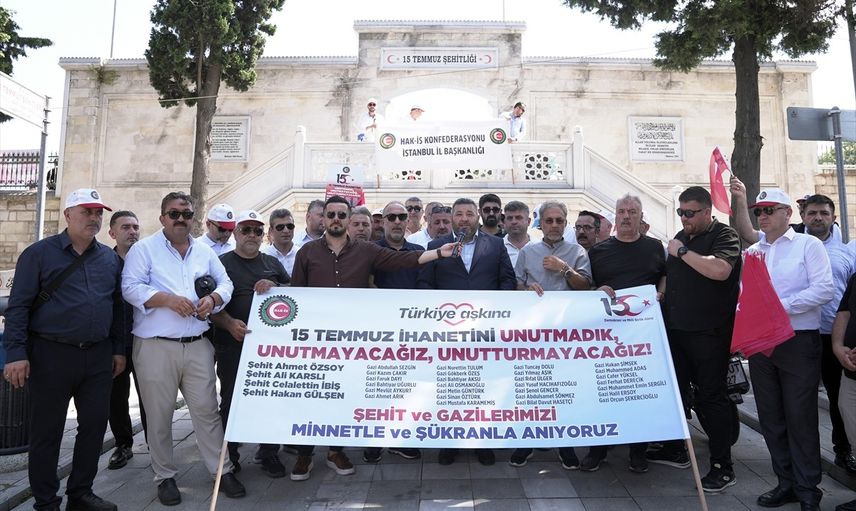 HAK-İŞ Konfederasyonu, Fetullahçı Terör Örgütü’nün (FETÖ) 15 Temmuz 2016’daki darbe girişiminde hayatını kaybedenler için Edirnekapı 15 Temmuz Şehitliği'nde düzenlediği anma törenine katıldı. HAK-İŞ İstanbul İl Başkanı Mustafa İluk (sağ 2) basın açıklaması yaptı.