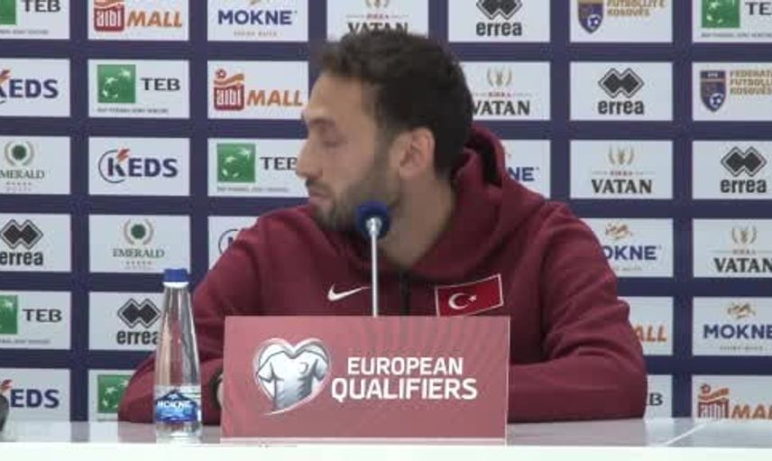 A Milli Futbol Takımı Kaptanı Hakan Çalhanoğlu, 2026 FIFA Dünya Kupası Avrupa elemeleri play-off finalinde yarın TSİ 21.45’te deplasmanda Kosova ile oynanacak maç öncesinde Fadil Vokrri Stadyumu'nda düzenlenen basın toplantısında konuştu.