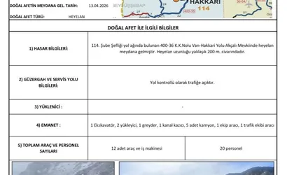 Hakkari Valiliği'nin açıklamasına göre, 13 Nisan 2026 tarihinde Hakkari-Van kara yolunun Akçalı mevkiinde meydana gelen heyelan, 400-36 K.K. numaralı güzergahta yaklaşık 200 metre uzunluğundaki bir alanı etkiledi.