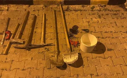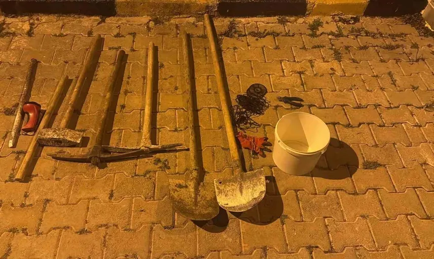 Olay yerinde yapılan incelemede ele geçirilen malzemeler arasında 1 adet balyoz, 1 adet kova, 2 adet kazma, 2 adet kürek, 1 adet tahta çubuk, 2 adet demir kesme makinesi, 1 metre uzunluğunda kablo ve 1 adet levye bulundu.