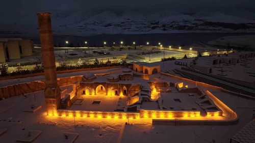 Hasankeyf’te kar ve gece ışıklandırmasının birleştiği görüntüler, binlerce yıllık eserleri ve Dicle Nehri kıyılarını kartpostallık bir siluete dönüştürdü.