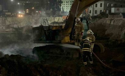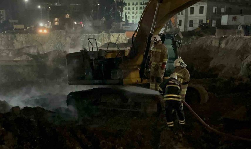 Armutlu Mahallesi'nde iş makinesinin temas ettiği boru patladı, yangında iş makinesi alevlere teslim oldu