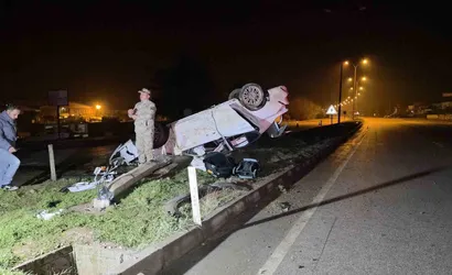 Kaza anı anbean güvenlik kamerasına yansıdı. Görüntülerde otomobilin aydınlatma direğine çarparak takla attığı anlar yer aldı.