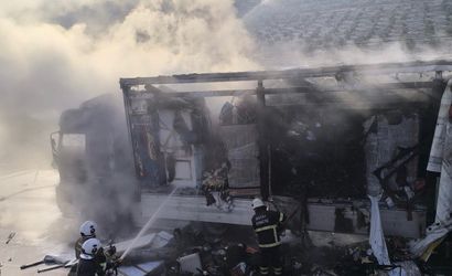 Hatay'da, Reyhanlı ilçesi Cilvegözü Sınır Kapısı mevkiinde Suriye'ye geçmek için sırada bekleyen eşya yüklü park halindeki bir tır, alev alarak yandı.