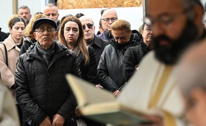 Hatay'da, 6 Şubat 2023 tarihinde meydana gelen depremde yıkılan Antakya Ortodoks Kilisesi'nin enkazı önünde, afette yaşamını yitirenler için bir ayin gerçekleştirildi.