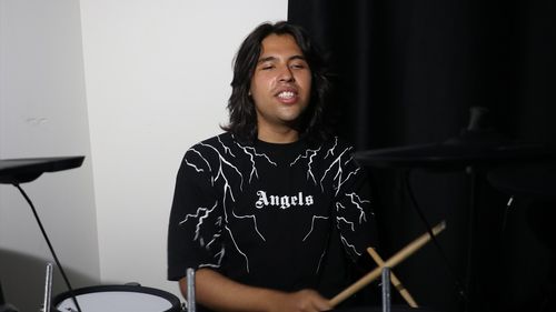 Hatay'da depremde kolunu kaybeden genç, streç filmle sabitlediği bagetle bateri çalıyor