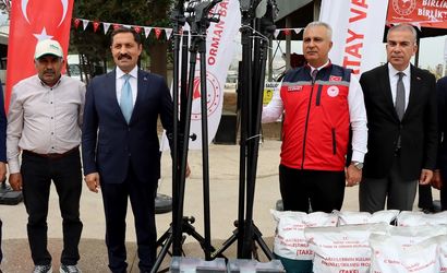 Hatay'da 6 Şubat 2023'teki depremlerden etkilenen çiftçilere, pamuk, soya ve ayçiçeği tohumu ile zeytin hasat makinesi dağıtıldı.