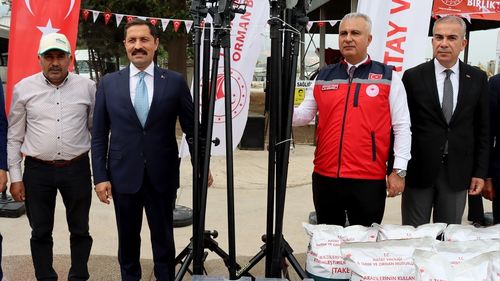 Hatay'da depremzede çiftçilere 153 bin kilogram pamuk, 100 bin kilogram soya tohumu ve zeytin hasat makineleri dağıtıldı.