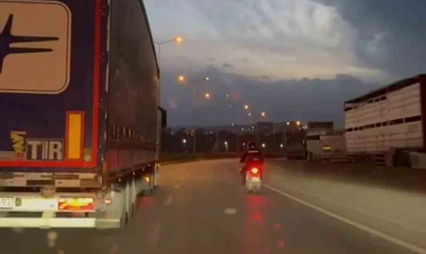 Tırın sağladığı koruma sayesinde motosiklet sürücüsü devrilme tehlikesi yaşamadan yoluna devam etti. O anlar cep telefonu kamerasına yansırken, paylaşılan görüntüler sosyal medyada kısa sürede ilgi ve takdir topladı.