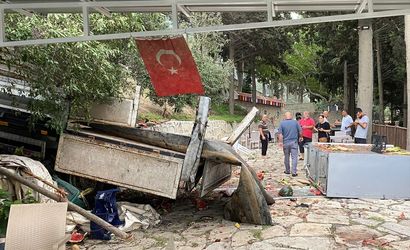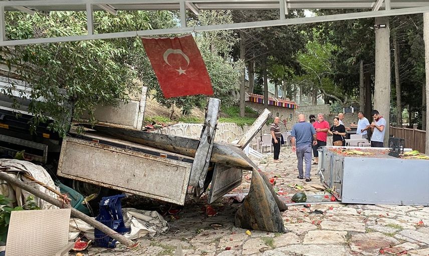 Hatay'ın Belen ilçesinde, freni arızalanan karpuz yüklü kamyonet bir kooperatifin bahçesine devrildi.