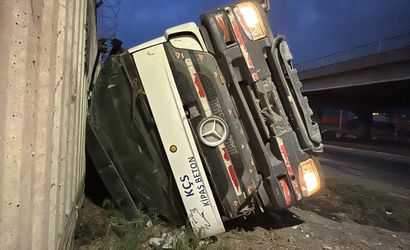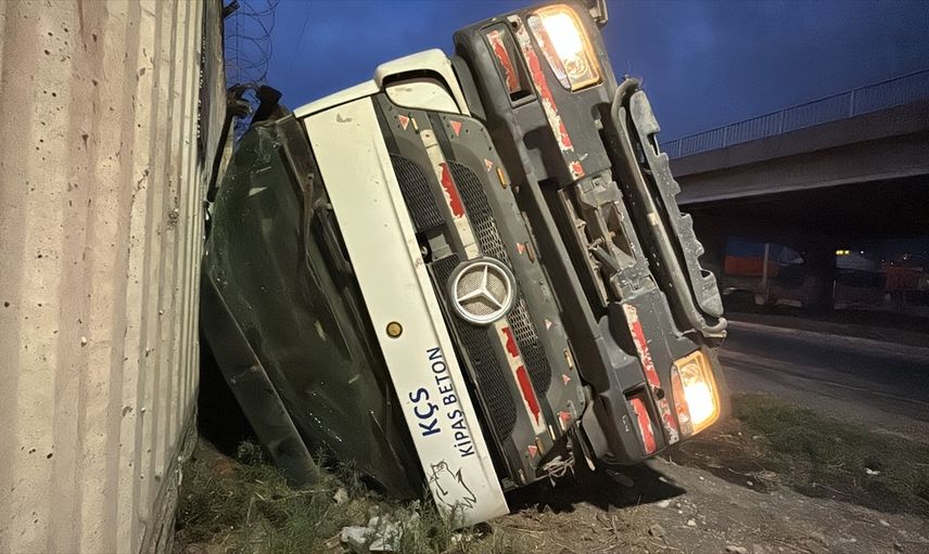 Hatay'ın İskenderun ilçesinde, freninin patlaması nedeniyle kontrolden çıkarak devrilen beton pompasının sürücüsü hafif yaralandı.