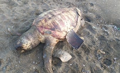 Hatay'ın Samandağ ilçesinde, Deniz Mahallesi kıyısında yürüyüş yapan vatandaşlar, sahile vurmuş bir ölü caretta caretta fark etti.