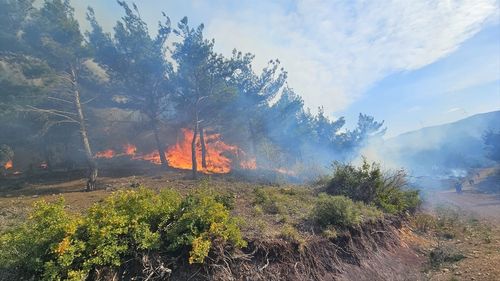Hatay'ın Arsuz ilçesinde meydana gelen orman yangınına müdahale sürüyor. Yangın, havadan ve karadan kontrol altına alınmaya çalışılıyor.