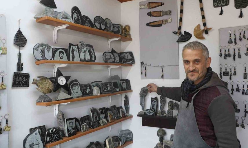 HATAY’DA HOBİ OLARAK BAŞLADIĞI SERPANTİN TAŞI İŞLEME SANATINI EKMEK KAPISI YAPAN ALİ GÜLER, 25 YILDIR EKMEĞİNİ TAŞTAN ÇIKARIYOR.