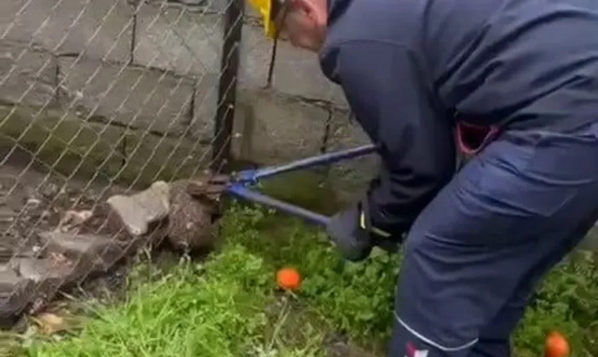 Hatay'da tel örgüye sıkışan kirpi itfaiye ekiplerince kurtarıldı