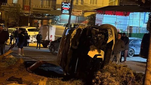 Antakya Avsuyu Mahallesi'nde Tofaş ile çarpışan otomobilin takla attığı kaza, sürücülerin hafif yaralanması ve güvenlik kamerası görüntüleri.
