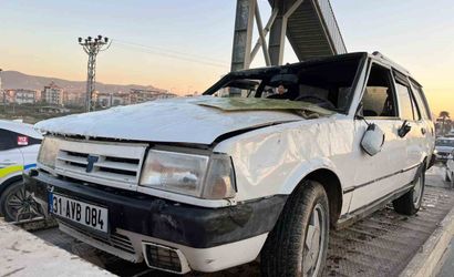 Hatay’ın Defne ilçesi Çekmece Mahallesi'nde trafikte seyreden Tofaş marka 31 AVB 084 plakalı otomobil, üst geçidin merdivenine çarparak takla attı. Araç ters dönerken hurdaya döndü.