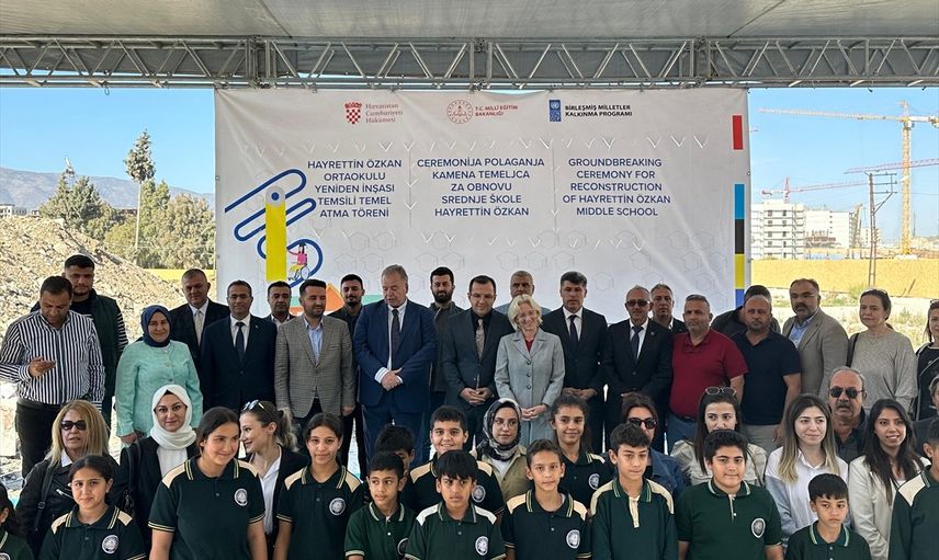 Hatay'da 6 Şubat 2023'teki depremlerde yıkılan Hayrettin Özkan Ortaokulu, Birleşmiş Milletler Kalkınma Programı (UNDP) kapsamında yeniden inşa edilecek. Depremlerde yıkılan ortaokulun yeniden inşasına başlamak için temsili temel atma töreni düzenlendi.