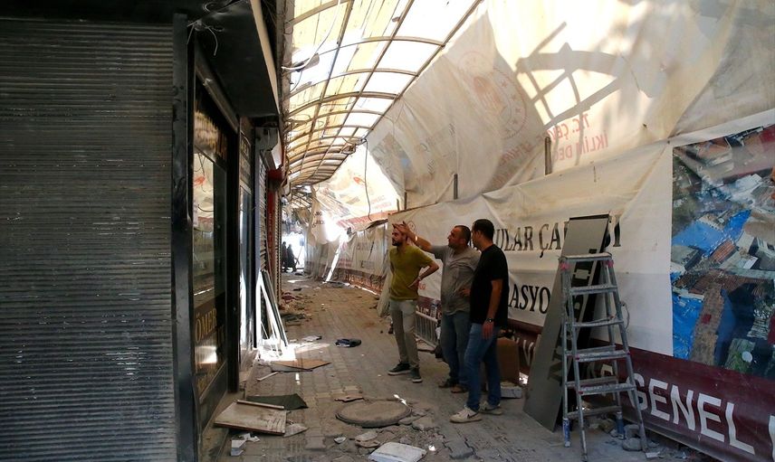 Hatay'da, Kahramanmaraş merkezli 6 Şubat 2023'teki depremlerde hasar gören tarihi Uzun Çarşı'da restorasyon çalışmaları devam ediyor.