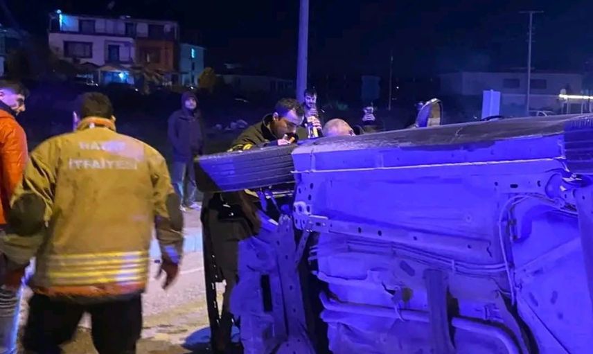 Hatay'ın Defne ilçesi Çekmece Mahallesi'nde seyir halindeyken vidanjöre çarpan bir otomobil takla atarak devrildi.