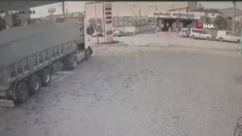 Dörtyol'da akaryakıt istasyonu önünde tır ile kamyonun çarpışması sonucu 5 araç hasar gördü; kaza anı güvenlik kamerasına yansıdı.