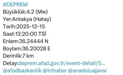 AFAD verilerine göre saat 12.20 sıralarında Hatay'ın Antakya ilçesinde 7 kilometre derinlikte 4.2 büyüklüğünde deprem kaydedildi. Deprem kent merkezinde hissedildi ve vatandaşlar tedirginlik yaşadı.