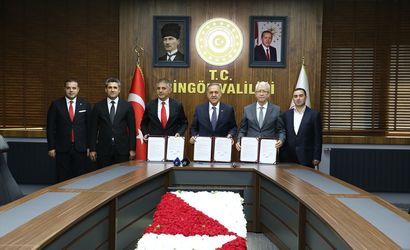Bingöl'de hayırsever iş insanı Veysel Demirci tarafından 8 derslikli okul inşa ettirilecek. Vali Ahmet Hamdi Usta (sağ 3), İl Milli Eğitim Müdür Yardımcısı Orhan Buğrahan (sağ 2) ve iş insanı Veysel Demirci (sol 3) arasında merkeze bağlı Güveçli köyünde inşa edilecek okul için protokol imzalandı.