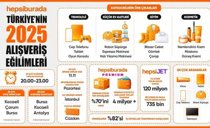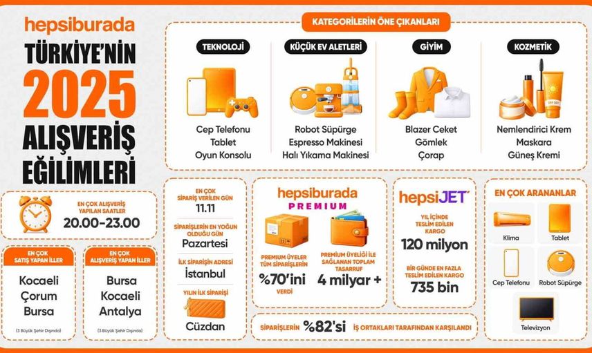 E-TİCARET PLATFORMU HEPSİBURADA, 2025 YILI BOYUNCA PLATFORMUNDA GERÇEKLEŞEN MİLYONLARCA SİPARİŞİ ANALİZ EDEREK TÜRKİYE’DEKİ ALIŞVERİŞ ALIŞKANLIKLARINA İLİŞKİN VERİLERİ PAYLAŞTI. AÇIKLANAN VERİLER, KULLANICILARIN ALIŞVERİŞ TERCİHLERİNDE TEKNOLOJİNİN GÜÇLÜ KONUMUNU KORUDUĞUNU GÖSTERDİ.