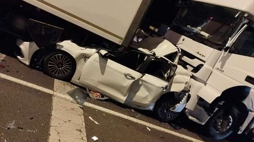 Erzurum'un Horasan ilçesinde tırların arasında sıkışan otomobilden 2 kişi yaralandı. Yaralılar hastaneye kaldırıldı.