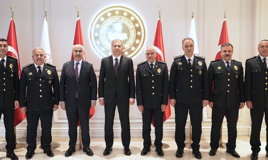 İçişleri Bakanı Ali Yerlikaya (sol 4), bazı illere atamaları yapılan il emniyet müdürlerini tebrik etti. Yerlikaya, Cumhurbaşkanı Recep Tayyip Erdoğan'ın tensipleriyle, Bingöl İl Emniyet Müdürlüğüne Beyti Kalaycı (sağ 2), Bilecik İl Emniyet Müdürlüğüne Hakan Yılmaz (sağda), Isparta İl Emniyet Müdürlüğüne Erdem Bildirici (sağ 3), Şanlıurfa İl Emniyet Müdürlüğüne Atilla Aksoy (solda), Ordu İl Emniyet Müdürlüğüne Ahmet Acar (sağ 4) ve Iğdır İl Emniyet Müdürlüğüne Niyazi Turgay'ın (sol 2) atandığını hatırlattı.