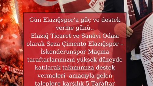 Elazığ Ticaret ve Sanayi Odası Başkanı İdris Alan, İskenderunspor maçı için Elazığsporlu taraftarlara 5 otobüs tahsis etti.